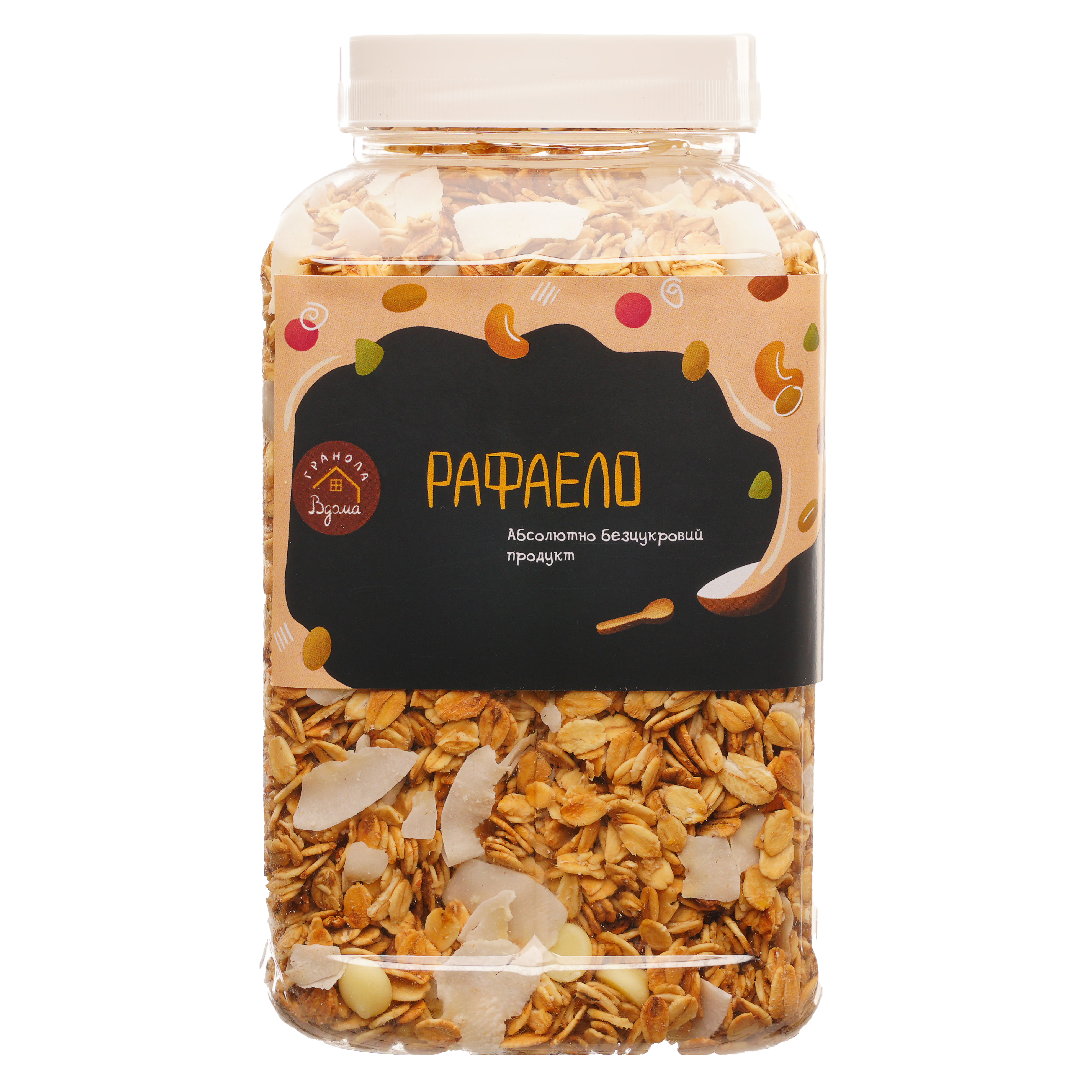 Хрумкі вівсяні пластівці, обсмажені з натуральним медом, поєднуються з кокосами мигдалем і кеш’ю. Додаємо трохи білого шоколаду — для того самого “рафаелівського” відчуття ніжності.